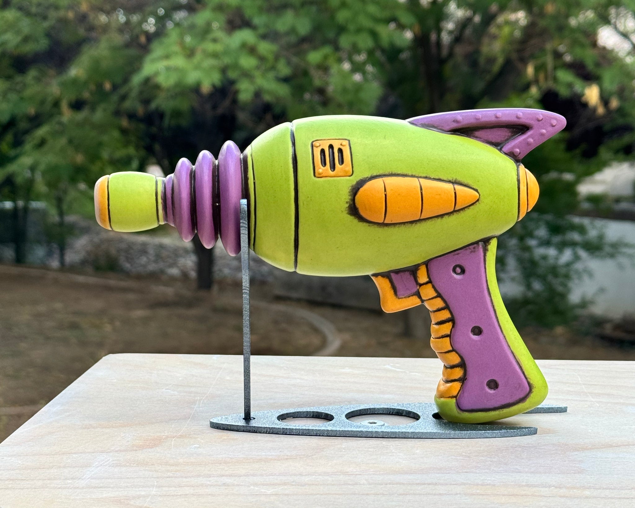 Handmade ceramic Raygun by Mike Biggs. Glazed inside and out with non-toxic glazes and can be used as a flask. Includes custom metal stand and rubber stopper.