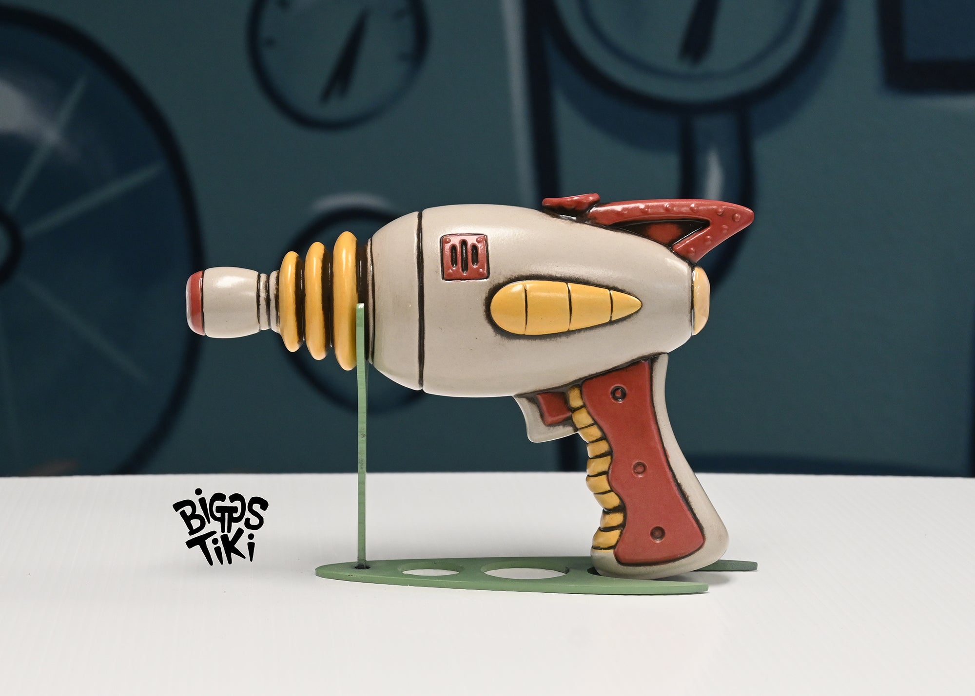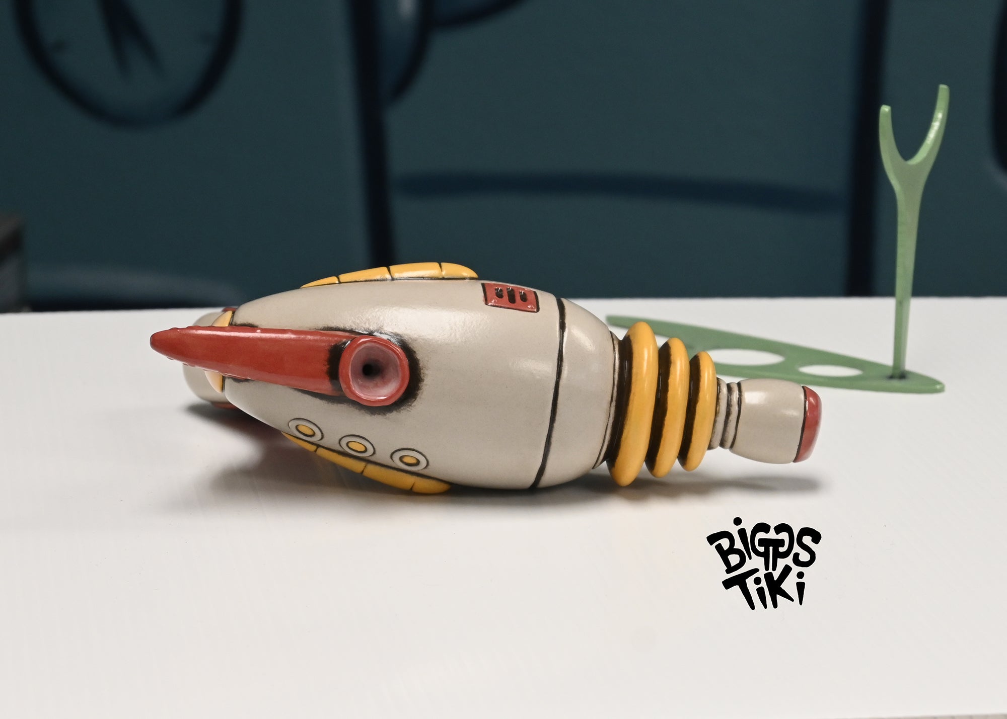 Handmade ceramic Raygun by Mike Biggs. Glazed inside and out with non-toxic glazes and can be used as a water pipe. Includes custom metal stand and rubber stopper.
